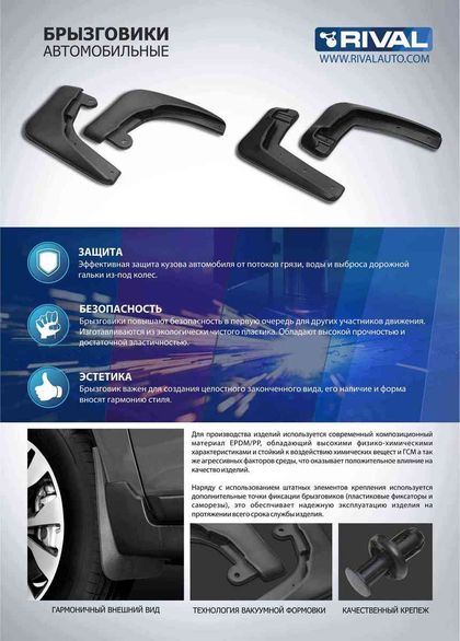 Брызговики Rival защищают покрытие автомобиля от грязи, мусора и посторонних предметов, летящих из-под колес вашего автомобиля во время движения.