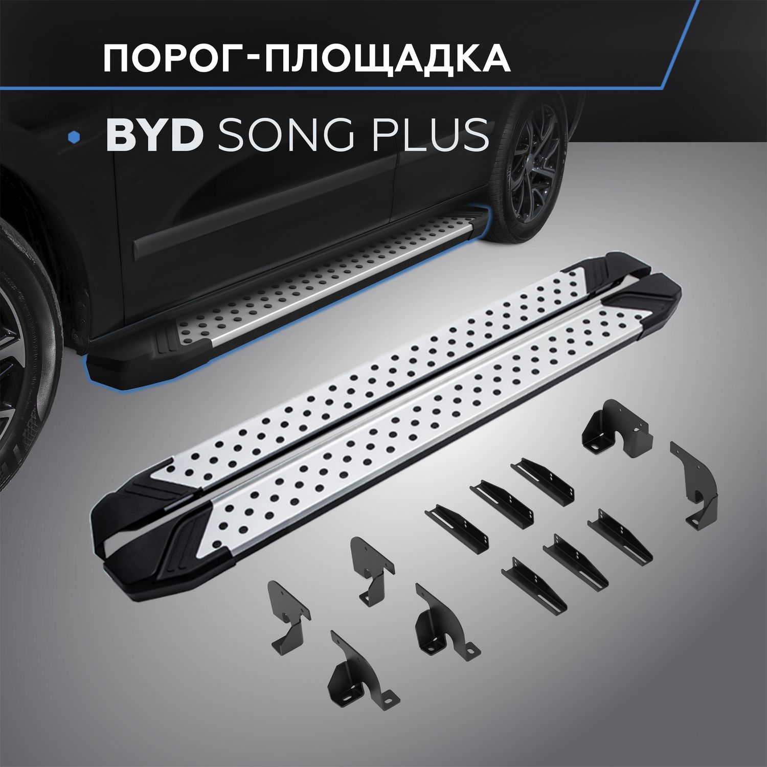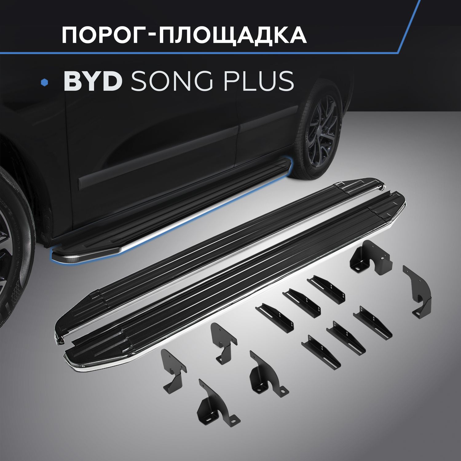 Пороги алюминиевые Rival Premium для BYD Song Plus I поколение рестайлинг 4WD (V-1.5 гибрид) 2023-2026. Артикул A180ALP.0701.1
