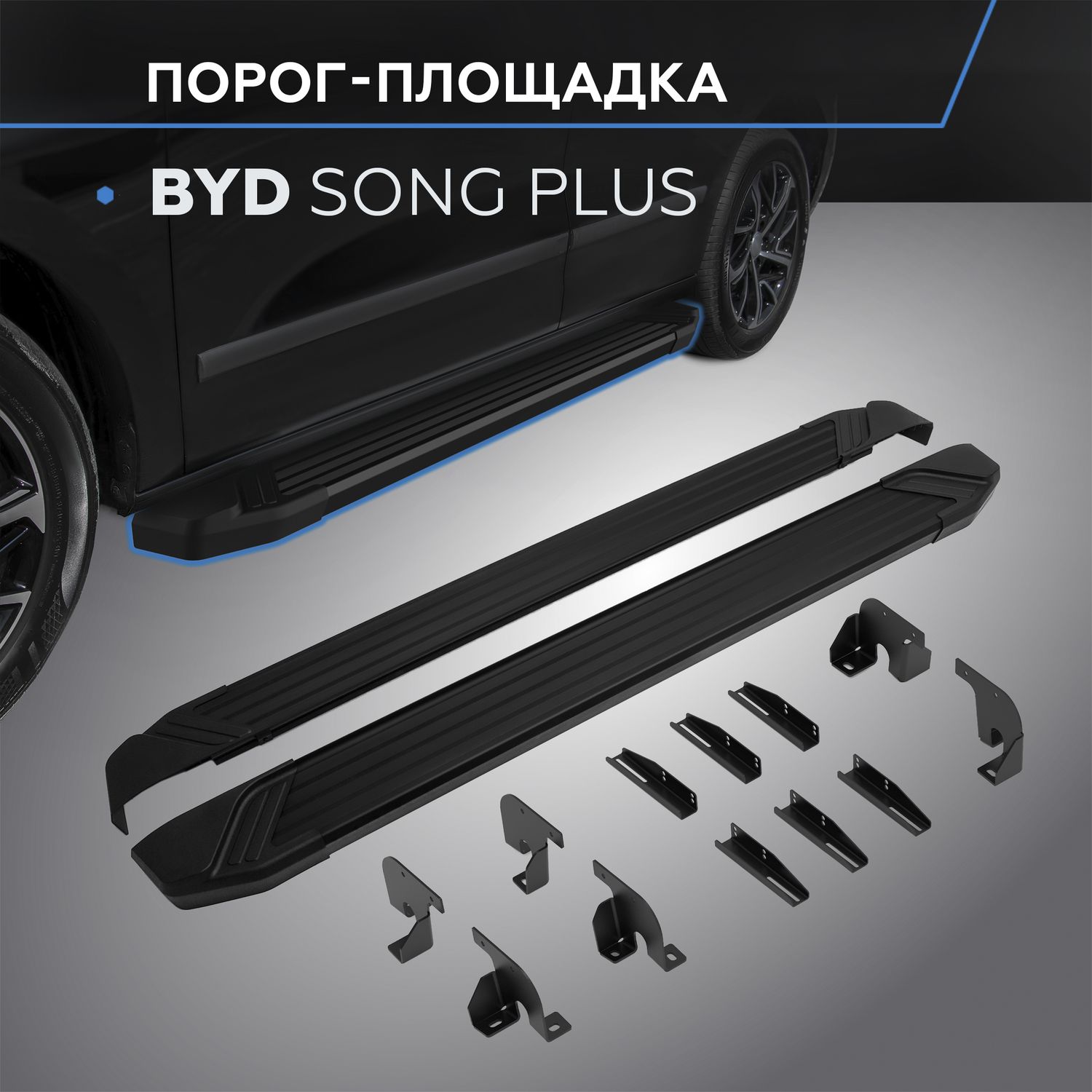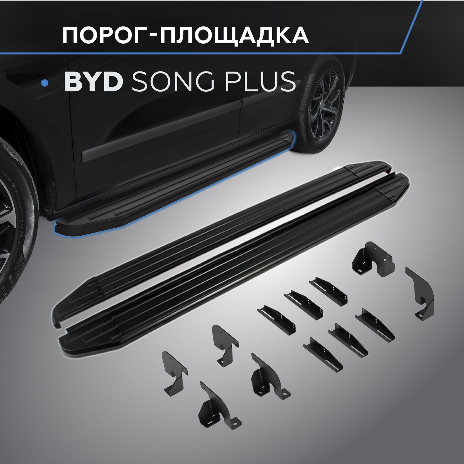 Пороги алюминиевые Rival Black для BYD Song Plus I поколение рестайлинг 4WD (V-1.5 гибрид) 2023-2026. Артикул F180ALB.0701.1
