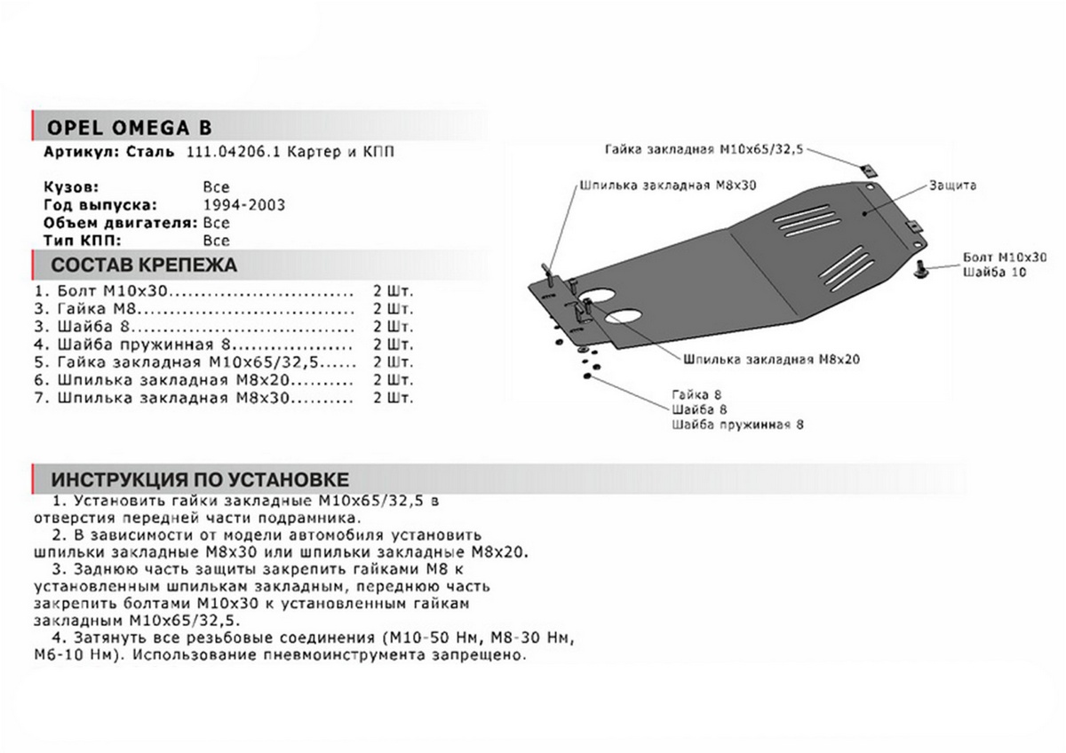| Комплектация | защита - 1 шт., комплект крепежа, инструкция по установке, упаковка |